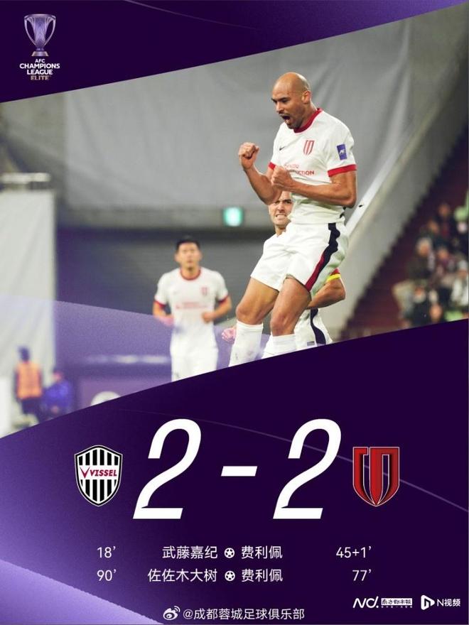 易边后,韦世豪在第76分钟造点,费利佩主罚命中、梅开二度,成都蓉城客场反超了比分。可惜比赛最后阶段,李杨禁区内犯规送给对方一记点球。佐佐木大树主罚命中,成都蓉城被对手逼平。